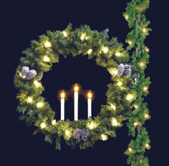 Sale!Triple Candle Wreath Pole Mount, includes pinecones and C7 lamps.