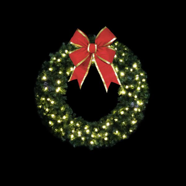 Our Deluxe Wreath is crafted with a Mountain Pine Branch Garland and features pinecones and LED lamps. You can choose between C7 LED lamps or mini lights. Single-sided.