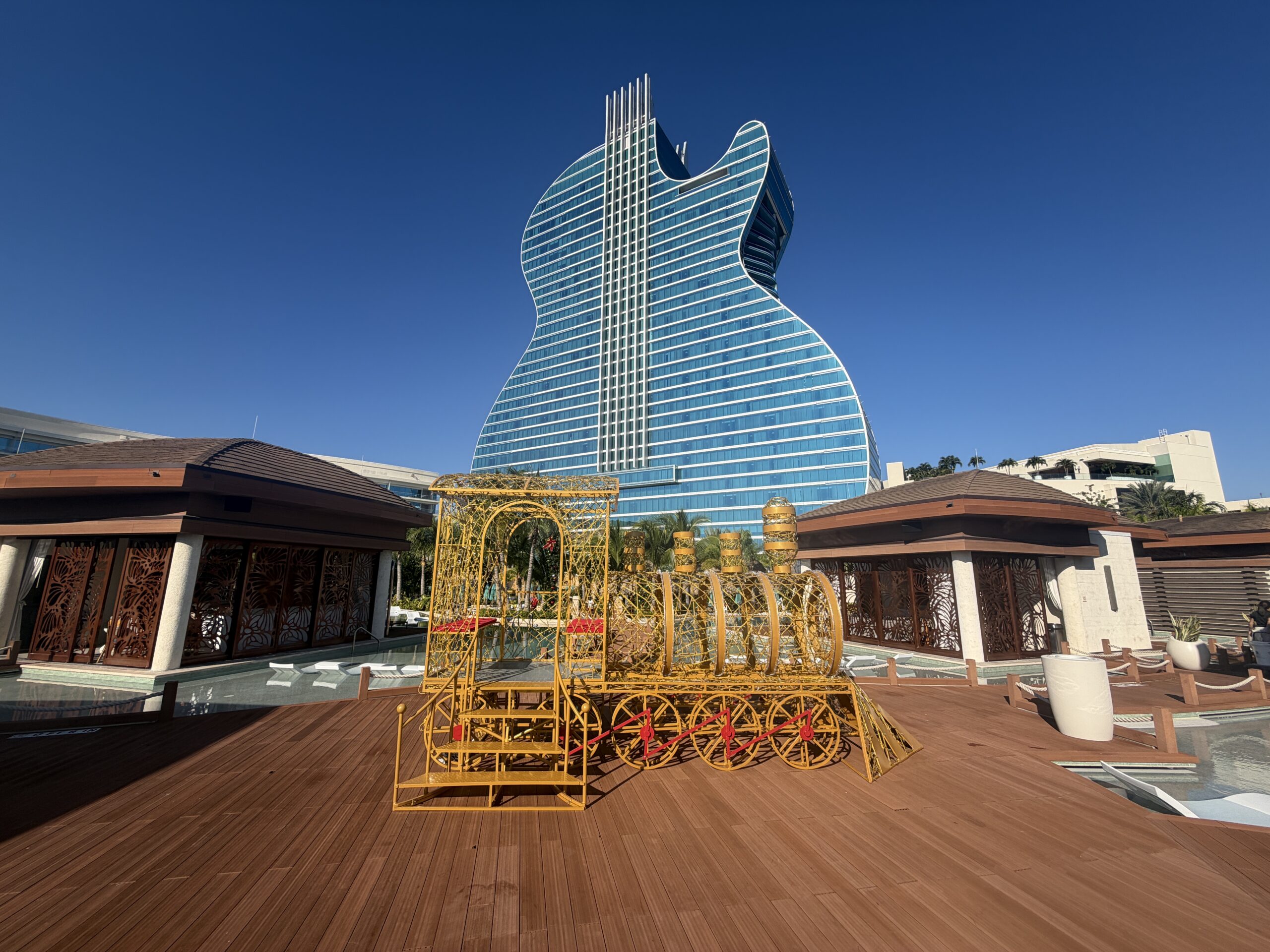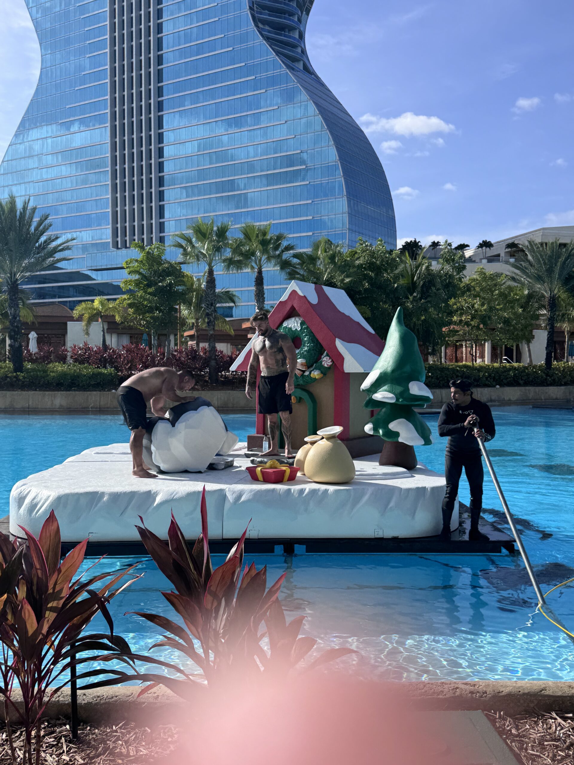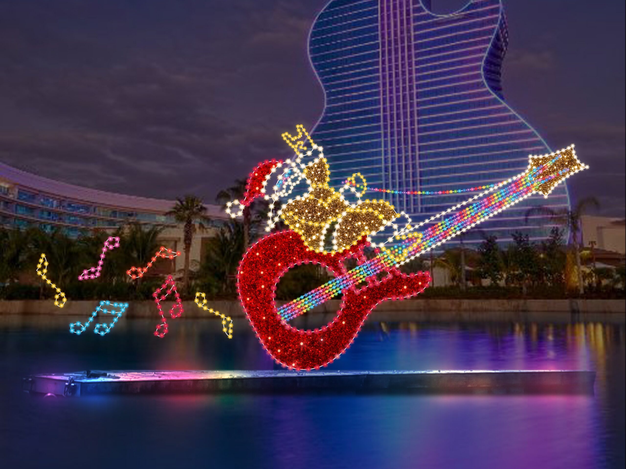 Designers also worked closely with the Hard Rock team to ensure the installations enhanced the existing architecture of the 450-foot Guitar Hotel tower, a visual centerpiece already known for its nightly light shows. The result was a master plan that blended iconic architecture, water features, and interactive holiday storytelling.