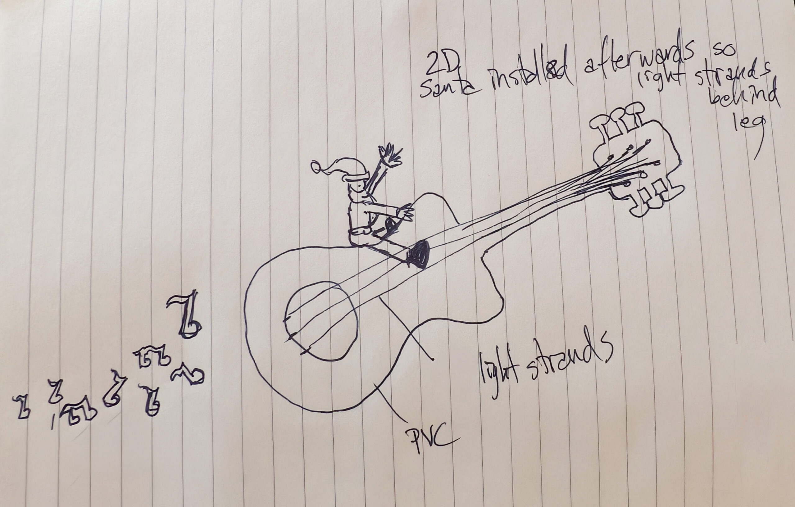 The character captured the DNA of Hard Rock instantly. Santa… but with attitude. Riding and rocking on his guitar, larger than life. A holiday icon that belongs to a rock-and-roll resort. That sketch became the starting point for one of the event’s signature custom displays.